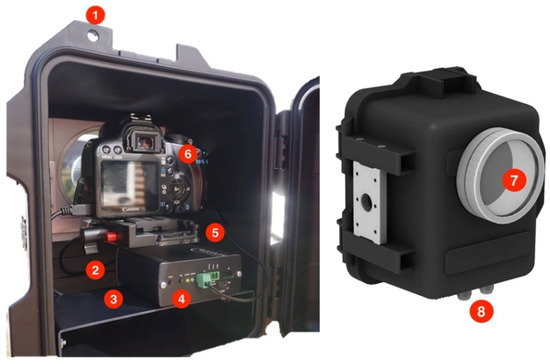 The first step of the proposed procedure is the remote acquisition and transferring of images. The implemented PAM allows for acquiring a sequence of images at predefined intervals of time. The PAM kit includes a single digital single-lens reflex (DSLR) camera, an intervalometer and a protective case (Figure 2). Specifically, a moderately priced Canon 2000D (maximum resolution ~24.1 megapixels and sensor APS-C CMOS) equipped with 18–55 mm lenses was mounted in a protective case. After installation of the acquisition kit in a convenient location (e.g., fixed to a bracket, mounted on a stable tripod, etc.), image capture was performed, automatically adopting a time-lapse controller with remote capabilities. The Bixicon controller [36] was chosen among others for its user-friendly GUI (graphical user interface), unlimited set of image acquisition intervals, remotely controllable settings via WiFi/3G/4G and data transmission capabilities. The 2D input data can be stored in both JPEG and RAW formats on the camera SD and/or in the controller memory. Additionally, acquired images can be transferred using an FTP server or saved on a cloud storage service (e.g., Google Drive, Dropbox, etc.) in just a few seconds. The protective case (dimensions: 23 × 30 × 25 cm; weight: ~5 kg), also provided by Bixion, can be easily adopted for both indoor and outdoor applications. Figure 2 outlines the main components of the case and shows an example of a typical internal configuration adopted for this work.