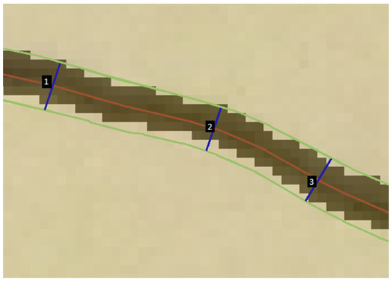 The Ridge Detection method described by [45] is used in image processing and computer vision applications to locate and extract curvilinear structures in digital images. The Ridge Detection method can be used to determine crack geometry, area, length and other properties crucial for maintenance decision making. Specifically, this algorithm estimates the sub-pixel maximum line of the segmented crack and its boundary (edge lines) (Figure 3). The width direction is determined through the normal to the maximum line. Crack width is obtained by calculating the distance between the edge lines measured along the normal line. Width values are calculated with approximately a one-pixel step until there is no crack pixel in the image. Average crack widths of the whole crack pattern are calculated as well. For both test sites, the Ridge Detection default parameters were used to measure crack width and length.