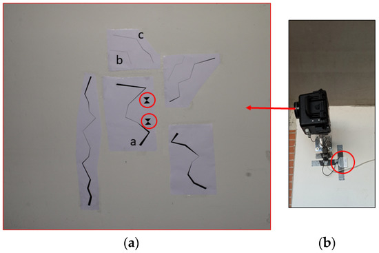 The CAD drawing was printed on two A0 (118 × 84 cm) white papers. Geometrical characteristics of the printed cracks have been verified using a digital vernier caliper with an uncertainty of ±0.01 mm to ensure that the printing process had not influenced the CAD measures (e.g., targets distance and crack widths). After the positive metricity verification, the crack posters were cropped and attached to an indoor flat wall of an unused indoor room at the Department of Engineering of University of Modena and Reggio Emilia (Figure 4a). Since the light on the laboratory test site was poor, a photography spotlight was used to guarantee homogeneous scene illumination during the whole acquisition process.