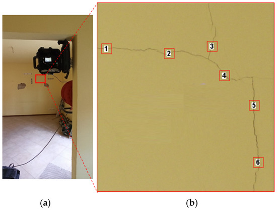 (a) The acquisition kit installed indoor for the on-site test. (b) Zoom in showing the crack and the locations of the six RoI used to quantify the precision of the proposed approach.