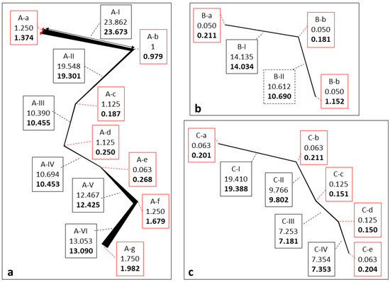Width (red box) and length (black box) values (in cm) along the three representative cracks (a–c). Each box includes CrackID, values from the CAD drawing and values estimated with the proposed approach (in bold).