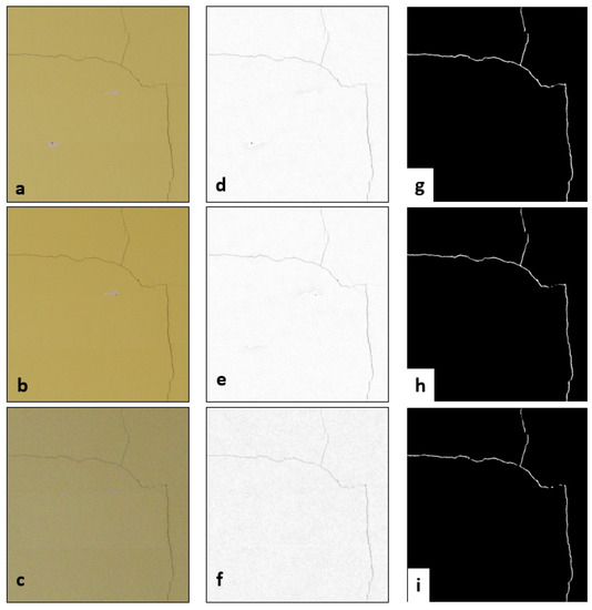Figure 8a–c shows three representative examples of acquired images with illumination variations selected from the on-site dataset. The POM produced a new set of images where uneven illumination and emphasized crack pixels are observable (Figure 8d–f). The crack detection results plotted in Figure 8g–i are satisfactory considering that most of the crack was correctly identified, and noise or other features were not detected. As illustrated in Table 3, for most epochs, a good level of completeness of automatically detected cracks is achieved (above 90%). On the other hand, with respect to epochs 7SITE, 8SITE and 9SITE, the performance of the automatic detection was lower. In fact, only approximately between 64 and 69% of the crack pixels were correctly detected when compared to the ground-truth.
