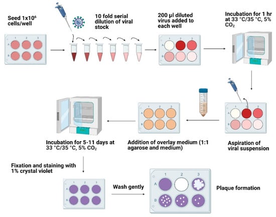 1 × 106 cells (HCT-8 and MRC-5) were seeded in a 6-well cell culture plate to achieve 80–90% confluency. The monolayers were washed twice with 1x PBS. Viral samples were diluted 10-fold in respective maintenance media (serum-free), and the appropriate dilution was added to the corresponding wells. A single well containing uninfected control cells was maintained to monitor cellular viability and plaque formation. The viral adsorption was carried out for 1 h at 33 °C for HCoV-OC43 and 35 °C for HCoV-229E in 5% CO2 with the intermittent rocking of the plates for 20 min to ensure even virions adsorption and to prevent the monolayer from drying. The overlay medium was prepared by combining 0.6% agarose (VWR Life Science, 97062-244, Radnor, PA, USA) with respective maintenance media. 2 mL of overlay medium was added to each well, and the plates were incubated for 11 days at 33 °C in 5% CO2 for HCoV-OC43 infected cells or 5 days at 35 °C in 5% CO2 for HCoV-229E infected cells (Figure 1).