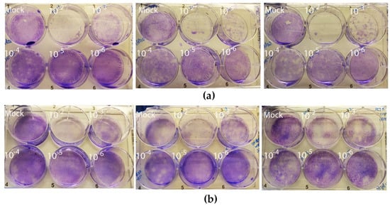 After incubation, 200 µL of 4% paraformaldehyde in a 0.1 M cacodylate buffer solution (Fischer Scientific, Hampton, NH, USA, 50-190-1157) was applied directly to each well, followed by incubation for 1 h at room temperature. The fixing solution was aspirated, and agarose plugs were removed. The cells were stained using 1% crystal violet solution (Millipore Sigma, V5265, Burlington, MA, USA) for 10 min with gentle rocking. The crystal violet solution was removed, and plates were dried to estimate the plaques count. The virus titer was determined according to the following formula: Virus titer (pfu/mL) = the average number of plaques/(dilution factor ∗ volume of diluted virus added to the well).