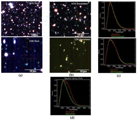 The analysis resulted in almost identical spectral profiles for the commercially acquired and prepared virions of HCoV-OC43 and HCoV-229E (Figure 3). However, the mean spectral comparisons of the HCoV-OC43 and HCoV-229E samples demonstrated the different spectral responses with ~30 nm shift of the spectral peaks. This is a crucial distinguishable feature that can be used for differential mapping and detecting both coronavirus strains in the solution. As these spectral plots represent the optical spectra derived in the process of converting the optical image from the scattered light to the spectral data, the resulting images frequently lose their original quality and the associated plots may not always generate sharp peaks with narrow full width at half maximum.