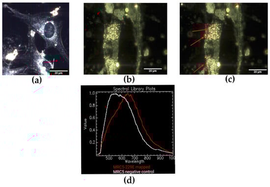 EDHM images for mammalian cells infected with HCoV-OC43 or HCoV-229E were examined using a 60x oil iris objective with the numerical aperture set to 1.2 NA and the quartz halogen light source adjusted to 150 watts power. The hyperspectral images were captured with an exposure of 0.25 s and 2x binning of the camera. After scanning the entire area of each infected cell, different areas containing suspected viral particles were captured with EDHM, and hyperspectral data cubes of the same size areas were captured for spectral mapping. Here, hyperspectral data cubes are hyperspectral images, which are analyzed by Spectral Angle Mapper (SAM) a robust algorithm utilized to determine the spectral resemblance between two spectral profiles and to match the pixels to the reference spectrum. Both uninfected (negative control) and infected cells were imaged following the same steps.