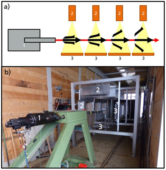 Experimental setup: accelerator—in this case, a 30 mm smooth bore cannon (1); flash X-ray tubes (2); and image plates (3). (a) Schematic drawing of the experimental setup showing the four imaging channels (consisting of one flash X-ray source and one detector each) of one of the two perpendicular viewing directions. (b) Photo of the setup. Only the X-ray tubes and image plates of position 1 are marked.