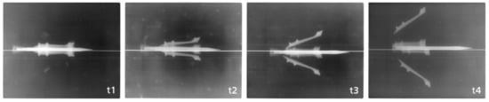 Example of the X-ray images for one orientation and all four positions (t1–t4). The first image at the point of time t1 is positioned 500 mm behind the muzzle; hence, t2 is at 1500 mm, t3 at 2500 mm and t4 at 3500 mm.