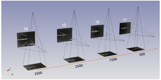 Therefore, a feasible approach for these cases is using X-ray technology. The state-of-the-art for X-ray analysis of dynamic processes is imaging by using flash X-ray tubes combined with a suitable detector, resulting in X-ray images with an exposure time of 20 to 35 ns [8,9]. Depending on the application, the two-dimensional information gained from the X-ray image is sufficient. However, if spatial information for all three dimensions is needed, the task is a lot more challenging. The means of choice for static objects or slower processes is computed tomography (CT), using several hundred X-ray projections to reconstruct a 3D volume. With certain limitations, this approach is also applicable for fast dynamic processes. A method for high-speed tomography is shown in References [10,11,12], using only six X-ray projections, resulting in a three-dimensional model at one certain point in time. A similar and additionally time-resolved approach based on theoretical simulations is described in Reference [13]; however, this method has not been tested experimentally within this paper. Both methods work without any knowledge about the tracked object. Contrary to this, the shape of the observed objects in the example used in this paper is known and available.