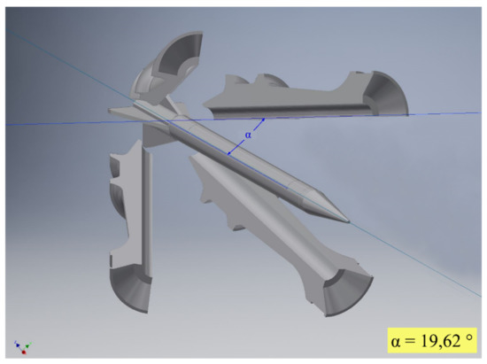 These data can be used to examine the behavior of the sabot parts and their influence on the projectile movement. For evaluation purposes, each part can be exported for each time step in a standard 3D format, such as STL, including orientation and position, allowing the import into a variety of commercial 3D evaluation software programs. As an example, Figure 5 shows a close look at one single position in a CAD software program, including the measurement of an angle between the projectile and a sabot part. Further examination, including measuring different angles and distances, is easily possible.