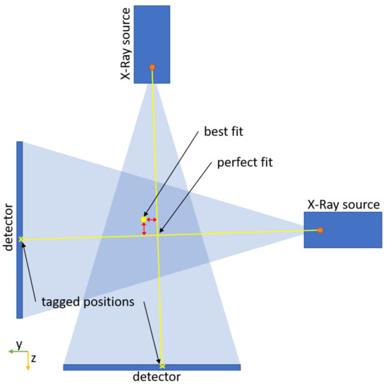 Schematic representation of the deviation for the error estimation in 2D (yz-plane). The deviation is shown as red arrows. The “perfect fit” is the intersection of the line between focal spot of the X-ray source and the tagged position on the X-ray image.