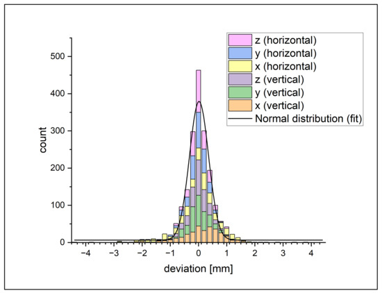 For the best fit, the location of the 3D feature points relative to each other is constrained by belonging to the same rigid body. Therefore, all discussed errors usually prevent a “perfect” fit (positioning of the rigid body) wherein all 3D feature points are projected onto the exact location where they are visible in the images. The effect of the errors is divided by the feature points by using a least-squares-minimization approach. To estimate the “perfect fit” position, the feature points in 3D were fitted without the constraints of the rigid 3D model. This led to a shift of the 3D feature points in space, given by the shortest distance in space they need to be moved to be projected onto the exact location at which they are observed in the images. This distance is regarded as the positioning error of singular 3D feature points and used for error analysis in the following. The histogram of all deviation values is shown in Figure 7.