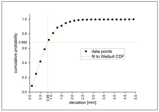 Cumulative probability plot of the spatial deviation (vector magnitude of x-, y- and z-deviation) of the feature points. The red line shows a Weibull cumulative distribution function (CDF) fit to these data points and is used to determine the standard deviation of the spatial deviation (shown in green).