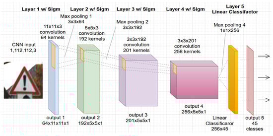 In this study, the authors used a convolutional network architecture developed specifically for the PRYSTINE project, see Figure 1. The project aims to realize Fail-operational Urban Surround network perception (FUSION) based on robust Radar and LiDAR sensors fusion and control functions to enable safe automated driving in urban and rural environments. The architecture of CNN PRYSTINE consists of five layers and is trained and tested with combined traffic sign and traffic light datasets [].