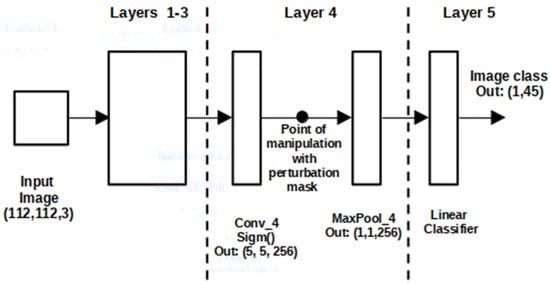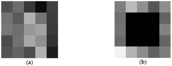 The region of a 3 3 perturbation mask was applied onto the fourth layer feature map before max-pooling of a 1 1 1 256 array. Figure 4 depicts an example of the CNN PRYSTINE four-layer output of a 5 5 feature map, where Figure 4a is a feature map without a mask, but Figure 4b is a feature mask, where a mask replaces the centre of the 5 5 output with a constant pixel value of zeros (black colour).
