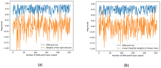 An example of the output signals of the DNN pool out from the 4th layer, representing the basic features in the DNN and linear classifier: (a) the corresponding signal/weights class that should have been correct, and (b) the most highly correlated signal/weights that were incorrectly selected as the correct class.