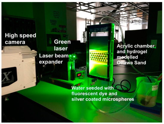 This study focuses on imaging of interparticle flow. The process requires the use of a high resolution and high-speed camera. Equipment to do so is indeed available, but very costly. The available camera is only capable of capturing up to 5 Mega-Pixel images at a frame rate of 250 Hz. Thus, the authors opted to scale up the particles in order to overcome the limitation of the resolution. Flow within the interstitial space was imaged by tracking the motion of fluorescent micron-size tracer particles that were made to fluoresce when illuminated by laser light. Refractive index matched materials to produce transparent granular media were used in order to permit laser light penetration into the model. Transparent soils have been used for over 25 years to permit visualizing conditions within soils [45]. In addition, only one high-speed camera and laser are available, so the problem was studied in 2D. Thus, flow fields within the pores between scaled particles were analyzed by Particle Image Velocimetry (PIV). PIV is a pattern matching algorithm used extensively for motion estimation in fluid dynamics [73]. A time-resolved displacement field was obtained from flow through the interstices of the granular media by performing PIV on consecutive images obtained from the high-speed camera. The methodology is demonstrated in a YouTube video depicting high-resolution flow of a different experiment projected in slow motion [74,75]. The following are the details of the system components (Figure 1).