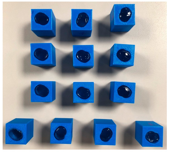 Hydrogel solution was made by mixing 100 mL of 12% Polyacrylamide (PAC) with 40 mL of 30% acrylamide solution and 59.4 mL of Deionized water. 0.5 mL 10% aqueous ammonium persulfate (APS) and 0.1 mL catalyst Tetramethylethylenediamine (TEMED) were then added to the solution. The mixing process did not result in air entrapment, thus placement under vacuum was not necessary. The resulting particles were sufficiently clear to permit the laser light sheet to penetrate through the entire model width. After mixing, the solution was poured into the mineral oil-coated 3D printed molds (Figure 4). The particles cured after 2–3 h and became stiff in the molds. Cured hydrogel particles were removed and stored in de-ionized water for 24 h, during which they swelled by absorbing water. It was observed that the tested hydrogel particles expanded by approximately 10% in length dimension compared to the mold size and little expansion was observed beyond that point, as also reported by Byron et al. [76]. Additional expansion of hydrogel particles can be problematic if the test is not run expeditiously because expanded particles do not fit in the precision-fit mold. Particles were preserved in a refrigerator to prevent microbial growth. The resulting particles resembled extruded two-dimensional Ottawa sand and cylindrical sand, which were then stacked randomly in a planar chamber to permit study of 2D flow between particles having different shapes.