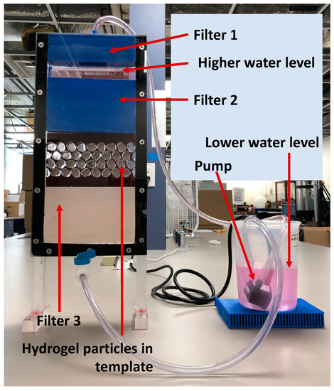 Testing apparatus showing hydrogel particles placed at a fixed porosity and saturating water infused with fluorescent nano particles.