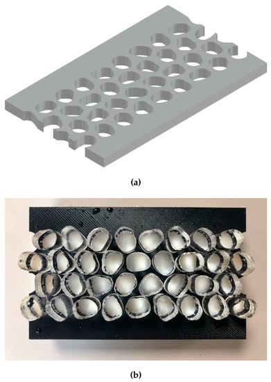 Custom template employed for precise distribution of particles within the model. (a) 3D printed template (top), and (b) template with hydrogel particles placed within it (bottom).