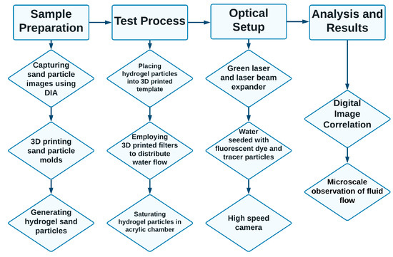 PIV was carried out by using PIVview 3C, which is a software package for analysis developed by PIVTEC in Germany. A window size of 32 × 32 pixels was employed. An overlap between the interrogation windows was chosen to be 50% of the final window size (16 pixels), which resulted in calculation of displacement fields on 32 × 32 pixels, which corresponds to a 1.3 × 1.3 mm grid. The analysis was performed in the frequency domain to speed up the computations. Features of the PIV algorithm used consisted of a multi-pass and multi-grid interrogation algorithm, as well as sub-pixel estimation, the details of which can be found in [83]. The experimental workflow is summarized in Figure 8.