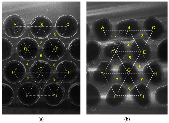 A constant head planar permeameter was designed for visualization of fluid flow through the interstitial pores of the granular media. The setup design was inspired by ASTM D2434 [79], with downward seepage flow. The setup consisted of a cuboid planar permeameter and a water reservoir (Figure 5). The internal dimensions of the permeameter were 200 mm by 25.4 mm by 360 mm (length × width × height). The dimensions of the chamber were selected to permit placement of 8 to 10 particles across the permeameter, depending on the test. The particles were typically 15 mm in diameter, and that size was selected to allow for the imaging system to capture flow in the interstices of the granular media. This width meets the specifications of [79], which requires that the chamber be 8–12 particle diameters in size. Particles were typically placed as 3 or 4 rows and held in place inside a template matching their exact perimeters. The use of a template was necessary to ensure that the interstitial flow pathways met strict design requirements, averaging 3 mm wide. The width of the template was 8 mm leaving a flow path that was 17 mm thick (Figure 6). All particles were placed such that their centers were spaced 18 mm from each other, leaving a nominal interstitial flow path of 3 mm. Cylindrical particles were evenly spaced, while Ottawa particles were randomly placed. Random placement of the hydrogel in water is believed to permit simulating the morphology of water deposited sand formations, while even placement of cylindrical particles provides for a controlled experiment for comparison. Initially, some sidewall leakage was observed but it was easily eliminated by adjusting the width of the chamber to accommodate particle shrinkage.