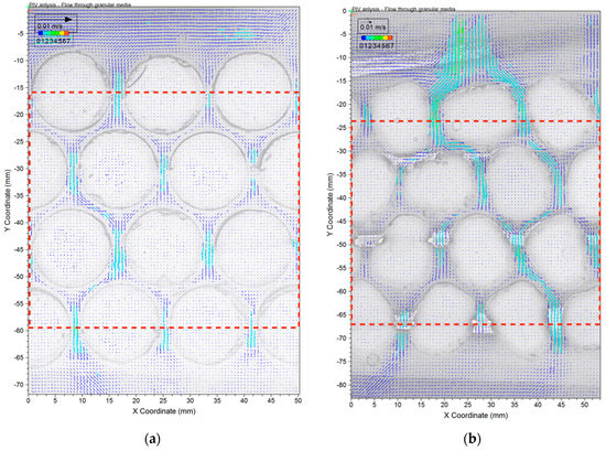 Flow images analyzed using Particle Image velocimetry (PIV) for (a) cylindrical particles and (b) simulated Ottawa sand.