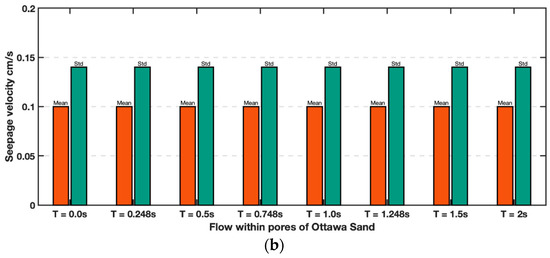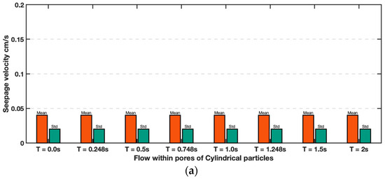 The average values of fluid flow for all 9 triangular windows shown in Figure 13 represent seepage velocity. The seepage velocities of Ottawa and cylindrical particles are compared in Figure 14. As expected, a smaller maximum and mean fluid velocity were observed in cylindrical particles compared to Ottawa sand, due to different discharge velocities, however, these values were approximately 2–3 times larger than the discharge velocity for each test. Discharge velocity may have been influenced by the overall experimental set up such as employed filters. Nevertheless, it is evident that flow within Ottawa sand experiences significantly more turbulence as evidenced by the standard deviation of fluid velocity in Ottawa sand is larger than the cylindrical particles.