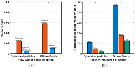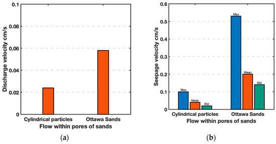 Comparison of average (a) discharge and (b) seepage velocities between perfect cylinders and simulated Ottawa sand particles.