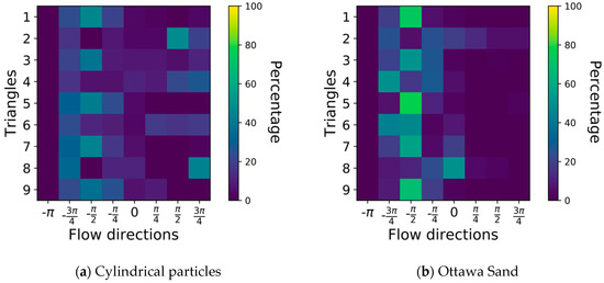 For each observation triangle, an 8 bin HOG is employed to represent all possible flow orientations and their percentage of occurrence in that triangle, for a total of 72 bins representing the spatial distribution of orientations within the flow (9 triangles × 8 bins). At each triangle a heat map is used for displaying the percentage of flow that falls within each HOG bin. Several observations are possible. First, because the flow is downward, orientations within the 0–π rage are limited, but not zero. In fact, 10–20% of the flow exhibited upward trajectory in Ottawa Sand, while 20–30% of the flow trajectories exhibited upward flow in Cylindrical particles. These results are difficult to see in the PIV plots (Figure 10), which suggests that they were dominated by vectors with small magnitude. Together, these observations suggest that the smooth curvature of cylindrical particles and symmetrical geometry is prone to causing small turbulence, while turbulence between Ottawa particles is larger in magnitude. The second observation is that flow between Ottawa sand is more concentrated in the downward vertical direction than for the cylindrical particles. This is also visible in the PIV results (Figure 10). Note that even though all observation triangles have identical porosities, the cylindrical particles are perfectly placed, resulting in identical interstitial flow paths while the Ottawa particles are randomly spaced resulting in somewhat arbitrarily sized interstitial flow paths. Indeed, water follows the path of least resistance and small differences in the flow channels resulted in a more concentrated downward flow in the Ottawa particles than for the cylindrical ones, similar to the Mathew effect.