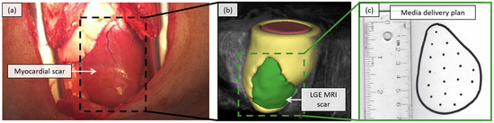 (a) Open chest surgical scene from a left lateral thoracotomy procedure, for delivery of a candidate therapy, in a porcine model of myocardial infarction, with (b) data from late gadolinium-enhanced magnetic resonance imaging (LGE MRI) to characterize myocardial scar tissue (green region), and (c) an example markup of a targeted media injection pattern, for the delivery of a candidate therapy, across the identified scar (target injection sites spaced 1 cm apart).