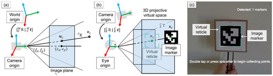 We performed a camera calibration procedure of the red, green, and blue (RGB) HoloLens 2 photo-video camera sensor (896 × 504 px at 30 FPS). Intrinsic parameters such as focal length , principal points , and skew , as well as extrinsic rotation and translation parameters , were estimated [26]. Together, these parameters described a perspective projection, which related points in world coordinates to their image projections (Figure 2a).