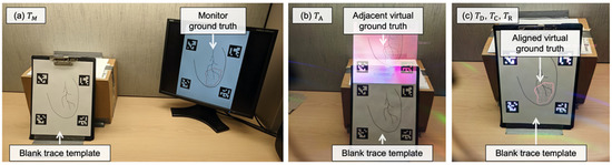 For the comparison study, four visualization paradigms were tested across four separate tasks. The ground truth and point-and-trace model was: (1) displayed with its real-world scaling on a monitor placed near the user () (Figure 3a); (2) displayed adjacent to the trace template via the HMD () (Figure 3b); (3) registered directly to the trace template using ArUco markers and displayed via the HMD () (Figure 3c); (4) registered directly to the trace template, using ArUco markers and displayed via the HMD, after performing per-user display calibration () (Figure 3c).