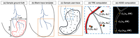 (a) A sample ground truth target showing the contour and target points in red. (b) A sample trace template and (c) scanned user trace result. (d) A sample target registration error (TRE) calculation, with circles fit to user-trace and ground truth points; (e) an average symmetric surface distance (ASSD) computation.