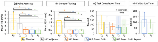 Quantitative results of the user-study. (a) Point accuracy was assessed as the mean target registration error (TRE), in millimeters, between user-points and ground truth points. (b) Contour tracing was measured as the average symmetric surface distance (ASSD), in millimeters, between the user and ground truth trace. (c) Task completion time and (d) per-user manual display calibration time were measured in seconds. HoloLens 2 (HL2) tasks are labelled. Significant results () are indicated by an Asterix (*).