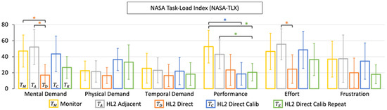 The results of the raw (unweighted) NASA-TLX are included in Figure 6 and serve as a subjective assessment of the perceived task load. We measured a significant reduction in perceived mental demand and required effort in the HoloLens 2 direct visualization paradigm (). When incorporating the additional per-user display calibration procedure (, ), the user-perceived performance displayed a significant improvement; however, this came at the expense of increased mental and physical demand, as well as perceived user-effort.
