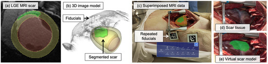 Prior to the imaging protocol, MRI visible fiducial markers were applied to the animal in a reproducible configuration. Using 3D Slicer [40], segmentations of left ventricle myocardium and scar tissue were created from the MRI data, resulting in surface models of each structure. Model decimation and Laplacian smoothing was performed on input segmentations in Blender (https://www.blender.org/, accessed on 28 December 2021) and provided smoothed voxel-wise 3D models of cardiac anatomy. To avoid occlusion of underlying anatomy, we used transparent surface rendering for virtual model visualization. The 3D locations of MRI-visible fiducials were extracted from image-space for the configuration of the ArUco tracking object in Unity.