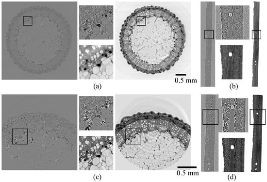 Volume slices with and without phase retrieval with enlarged insets. Images without phase retrieval (phase contrast tomography, gray background) are left/above and with phase retrieval (holotomography, white background) are right/below. Rose stem sample: (a) LR, (c) HR; CFRP sample: (b) LR, (d) HR. As is usual for holotomography, ring artifacts are the most prominent artifacts present. The scale is identical for all ROI and for all large FOV scans; the insets are identical areas for ROI and large FOV and have a side length of 0.4 mm.