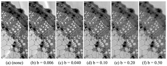 Figure 2 shows multiscalar holotomographies for different strengths of the merge artifact removal method, characterized by the adaption strength b. The area shown is at the left edge of the ROI area and the merge artifact appears only at the edge of the ROI and is similar for the whole edge. For comparison, in Figure 2a, the merge artifact removal was not applied. Figure 2b–f show an increasing adaption strength. Image (b) corresponds to an adaption value too low for an effective artifact removal, whereas, in (e–f), the value is too high and produces small-scale artifacts. From these images, b = 0.1 was selected for the following multiscalar holotomographies.
