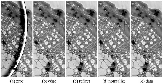 The padding methods we tested are: (a) Zero padding—filling the outer area with zeros. (b) Edge padding—filling the outer area column-/row-wise with the values at the edge pixels (e.g., used in ANKAphase []). (c) Reflect padding—filling the image area outside with the same values as inside, but reflected at the edge.
