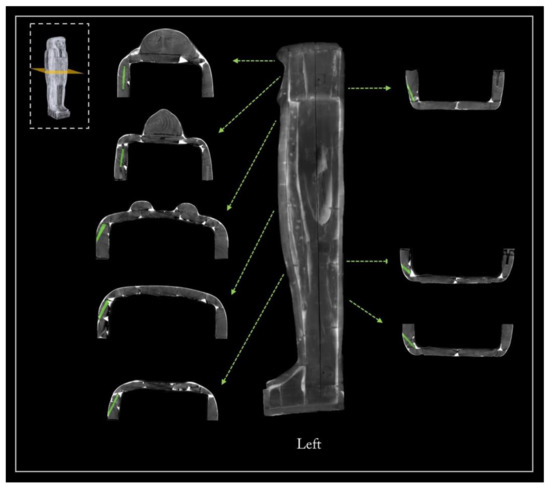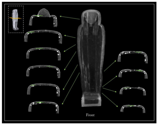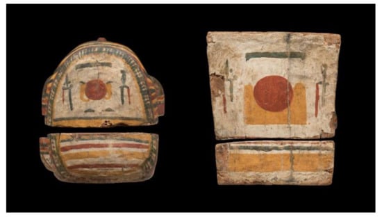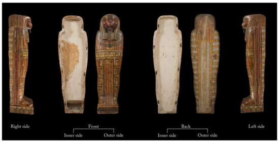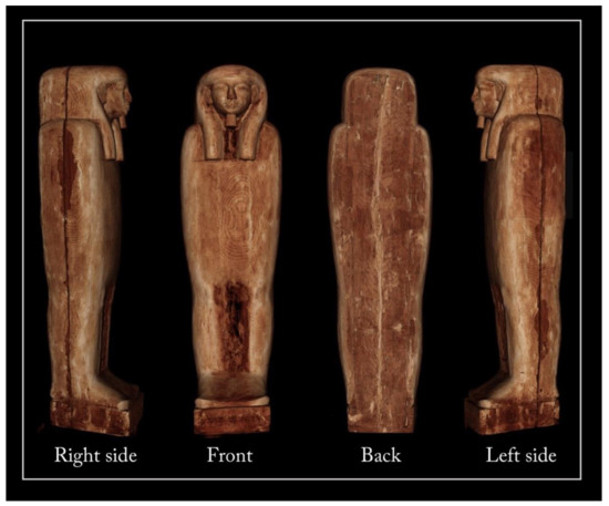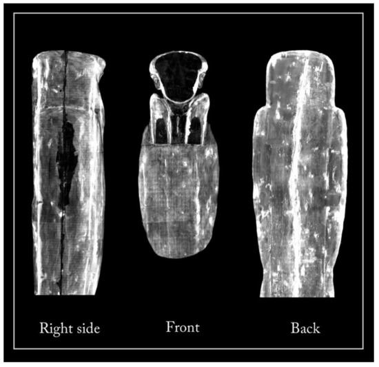 Among the scientific projects concerning the study of ancient Egyptian artefacts, it is also worth mentioning The Egyptian Coffin Project of the Fitzwilliam Museum in Cambridge [47]. In 2014, the Museum began a broad, interdisciplinary research effort into its collection of Egyptian coffins and coffin fragments, involving the application of advanced analytical and imaging techniques, including radiography and computed tomography. Their research provided remarkable insights into the coffins’ construction and decorative programme, and all the results are freely available to the general public [47]. Most often, in the past, only X-ray radiography was employed as part of a multi-technique approach [48,49,50,51,52].