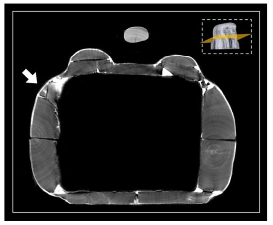 (a) Axial slice showing the matching growth rings of the side planks; (b) partial detachment of the growth rings, ring-shake (indicated by the orange arrow).
