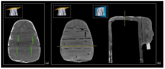 Re et al. [46] highlighted the importance of tomography in the study of wooden artefacts, making a comparison with radiography in the case of Taiefmutmut’s coffin lid. Even though the artefact was quite simple in geometry and constituent materials, the results obtained with the two techniques were noticeably different. In particular, tomography provided more information, not only on the state of conservation, but also on manufacturing techniques and previous restorations. However, it should be noted that the tomography of an entire coffin generally requires much longer acquisition times (potentially many hours) than radiography [1].