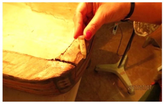 The front of the lid consists of four narrower planks, obtained from small diameter stems and joined by round dowels (Figure 7). The central plank decreases in width, owing to natural tapering, and moves slightly to the left, proceeding downward. The plank on its left is integrated with a small insert, with a triangular section placed next to the upper chest (Figure 8), while the two planks on its right were probably of the same size in the assembling phase, and were reduced during the final modelling. These two planks are tangentially cut and are barely sufficient in some portions. The most central one seems to be positioned upside down, with the recto facing outwards, unlike the others, and in the lower part, it shows large areas of grouting and several inserts applied upside down. Several defects clearly visible on the plank would be compatible with a tangential cut from a stem characterized by several irregularities, typical of the identified tree (Ficus sycomorus).