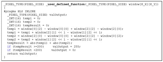 Using generic SCPs is useful during the algorithm experimentation stage because the hardware does not need to be changed even if different functions are selected. However, once the algorithm is finalized, more efficient function-specific coprocessors for compound operations can be created. To make this convenient without requiring hardware knowledge, we provide a set of SCP skeletons. These are effectively hollow codings of the above four classes of SCP (point, neighborhood, global and block). The skeletons contain HLS code to manage the dataflow patterns of each type of operation. In this way, users need only to supply the core pixel-level function in the form of a simple C/C++ function. It is in this C function that the user specifies the arbitrarily complex operation. Users can code detailed optimizations, for example, by embedding constant kernel coefficients. An example that we will see later is an SCP specifically for a more efficient implementation of the Sobel edge detector.