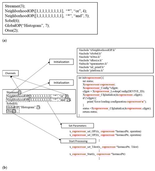 When the developer introduces a new SCP instance in the textual DFG description, behind the scenes, one of the free instances of the SCP will be acquired from those still available in the user-selected configuration. The parameters in the DFG are used by the TCG tool to generate and set the various properties of the SCP in an object-oriented fashion. Code is also generated to form the connections via the channels in the AXI4-Stream Interconnection scheme described above. This code is for the Xilinx SDK after the hardware platform has already been defined and synthesized. For example, Figure 7 shows the TCG-generated code for the Xilinx SDK to set up a complex SCP (of type NeighOP2) followed by a thresholding SCP (of type PointOP) for the Sobel operation outlined previously, based on a two-step rotating kernel.