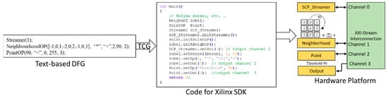 Normally, users could use the default Xilinx SDK to program the Zynq-based hardware platform in baremetel mode or use PetaLinux+Xilinx SDK to build a Linux-based application. In this stage, there is no hardware level design; normally users can develop their application in C/C++. Users need to use the HLS-exported driver to create their own initialization function, set all the parameters individually, and invoke them for execution. We use the AXI4-Stream Interconnect for connecting all our coprocessors (see later) to match the user-supplied DFG. This textual DFG specifies the coprocessor instances, their parameters, and their interconnection channels. Our Textual Code Generator (TCG) tool takes the text representation of the DFG and generates the executable C code for the Xilinx SDK. This simplifies and speeds up the development of the final application.
