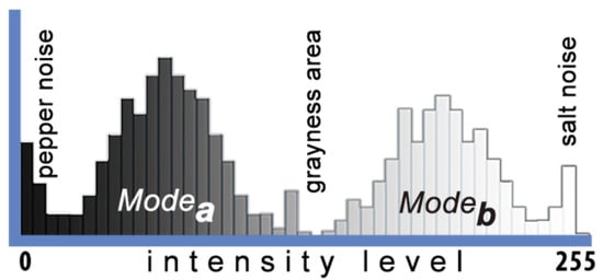 Filtering approaches such as geometric, harmonic, contra-harmonic, and alpha trim were proposed in literature as noise reduction filters under a pure image processing approach [10]. They were adapted for the histogram version as mean estimators for MCET [15], where both (t) and (t) were estimated using the same mean filter approach. The use of homogeneous approaches was able to exclude some undesired parts from the mean value to improve MCET. However, some cases faced overlapping issues. In general, the presence of salt noise was located in the highest intensity levels and the pepper noise on the opposite side, as shown in Figure 1. For example, if a harmonic filter used, it will enhance the mean value, with some limitations, e.g., it excludes the salt noise, but it is not suitable for pepper noise in the first region; similarly, when using a contra-harmonic filter with positive and negative values of Q.