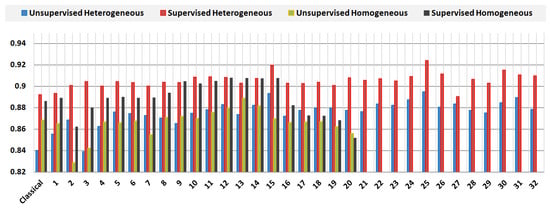 The first input in Table 2 refers to the original Gaussian-based MCET that has a steady classical mean. The rest of the inputs refer to the related homogenous mean-based MCET and the proposed heterogeneous mean-based MCET. The comparison of experiments was examined using the average value of the unsupervised and the supervised evaluation score. The proposed heterogeneous model was able to produce effective results over the related methods; depending on the patterns of the evaluation in Figure 5. It can be noticed that the best segmentation results appeared in test case number 25; this is and were estimated using the contra-harmonic mean filter with heterogeneous Q = +0.5 and −1.5, respectively. The impact was noticeable also in the test case number 15 compared with the related homogeneous approach; this is was estimated using the harmonic mean filter and was estimated using an alpha trim mean filter with d/2 = 55. The proposed model showed that it has the ability to fill the gaps related to noise combinations in different regions that were found in the related homogeneous mean-based MCET.