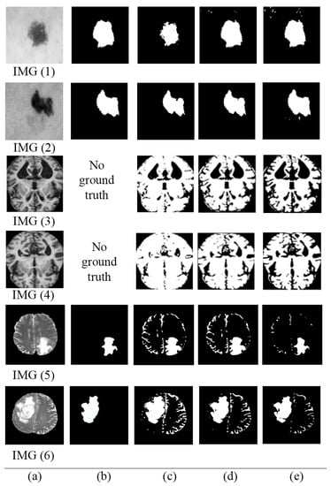 Figure 6 shows randomly selected images and their corresponding segmentation results. Figure 6a–e shows original images, ground truths, and segmented images using the original MECT, segmented images using MCET based on homogeneous mean filters approaches, and segmented images using the proposed MCET based on heterogeneous mean filter approaches, respectively. Table 5 shows the performance measured using supervised and unsupervised evaluation for segmented images in Figure 6.